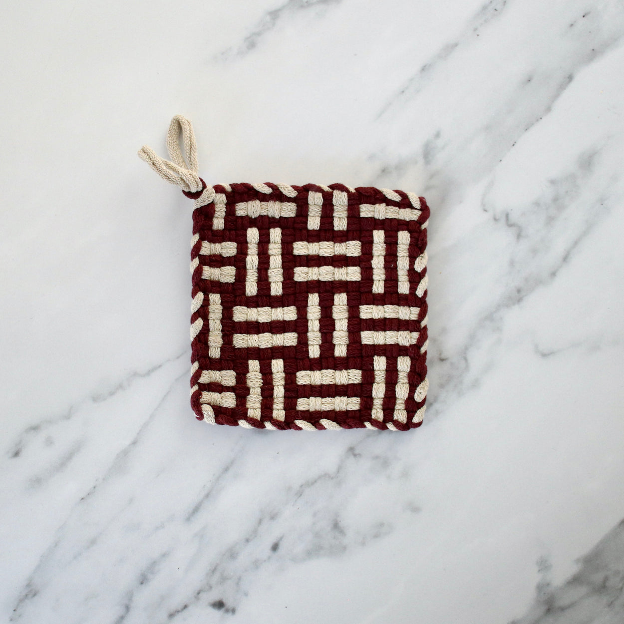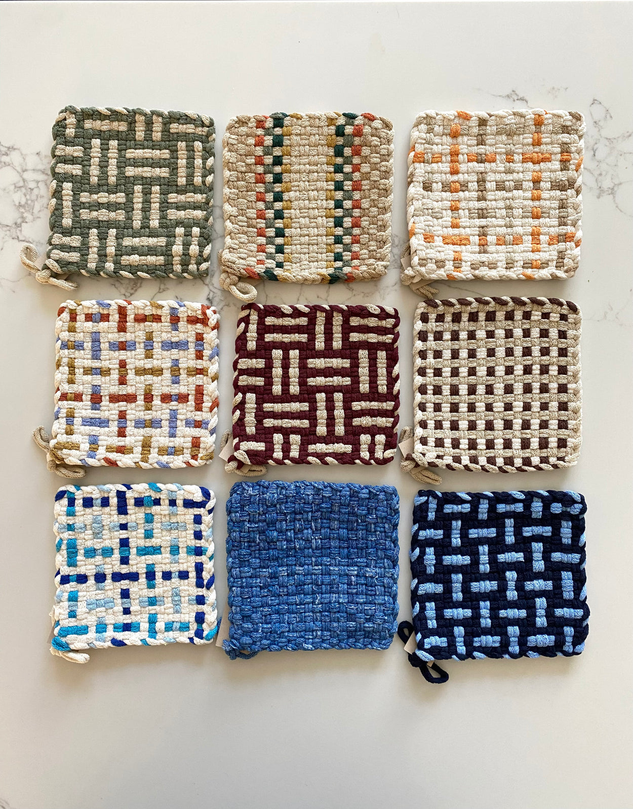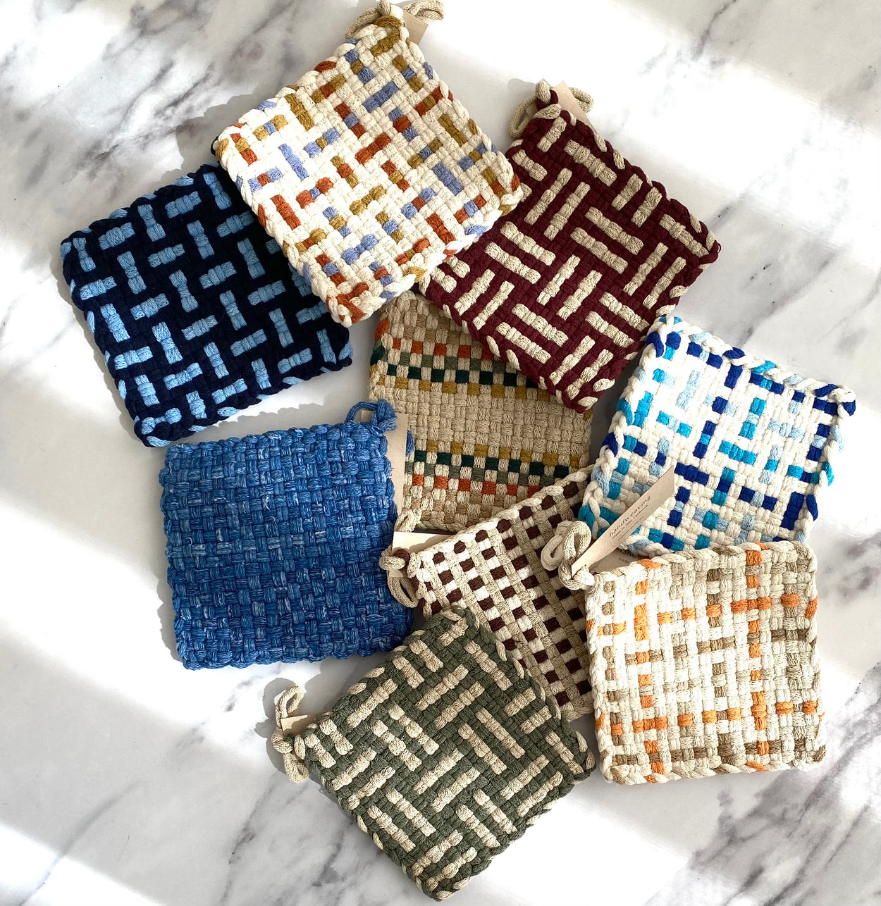 These expertly handwoven potholders are a practical and elegant addition to any kitchen. Each is made by hand with love in Ojai, California, bringing time-honoured weaving techniques into harmony with contemporary colour and design. They make a beautiful gift or accent to your own kitchen.